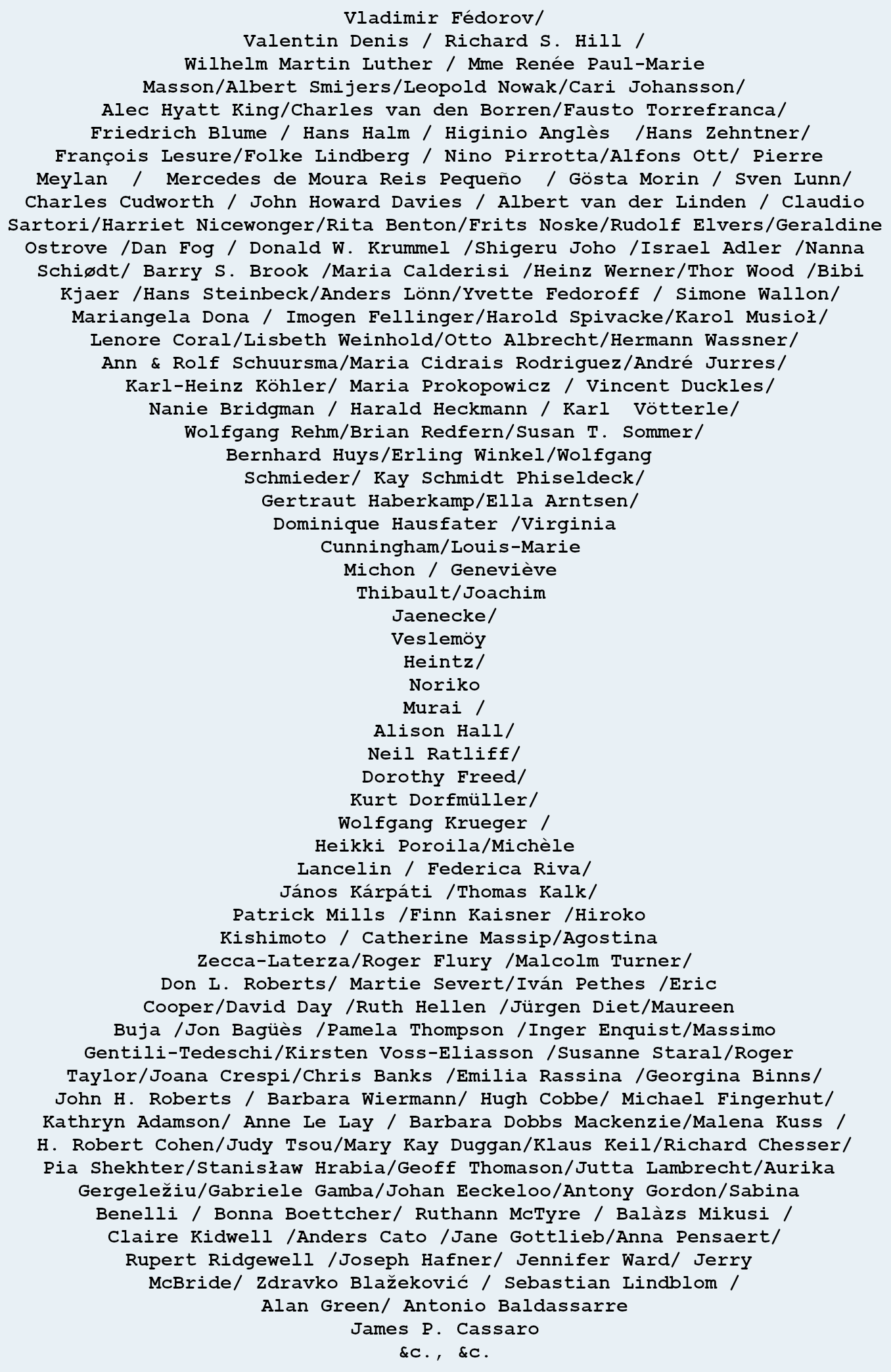 The IAML “hourglass” presents a history of IAML in graphic form. It reminds us that, although our Association has an administrative and governance structure to hold it together, it is the people of IAML who have given life to it in the past, do so in the present, and will continue to do so in the future. From the period between the 1949 World Congress of Music Libraries in Florence and the first official IAML congress in Paris in 1951 we have nothing beyond a few written records, making the hourglass (arranged roughly chronologically, beginning at the top) little more than a record of names. But as we move through it, we perhaps begin to have our memories stirred by seeing the names of people whom we first encountered at a IAML meeting and, later, got to know a little better. In this respect the hourglass serves as an aide-mémoire, a channel for happy reminiscences of people and places. Some of these people may have been active in IAML for a comparatively short time, others for longer; but all have made their contribution.