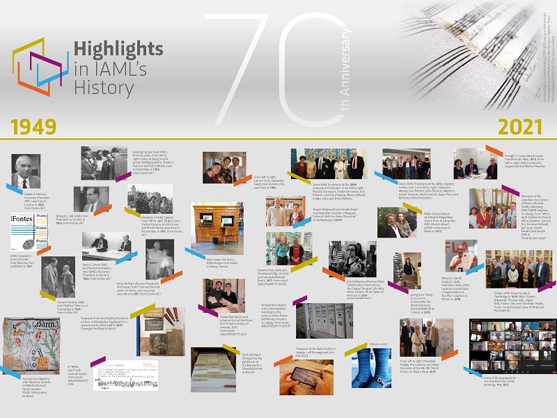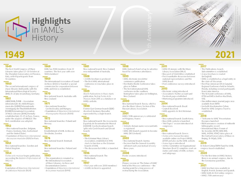 This “hourglass” builds upon the one created by Maria Calderisi that opened the special issue of Fontes artis musicae (volume 48, no. 1) celebrating IAML’s 50th anniversary in 2001. John Wagstaff, IAML’s Historian, here brings the story up to date for the Association’s 70th birthday.