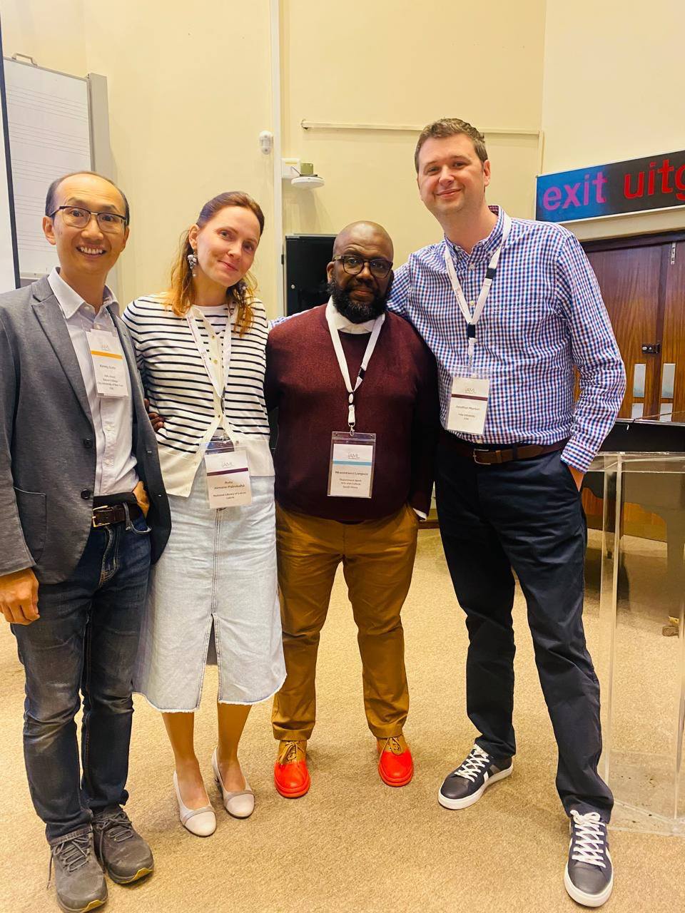 Fotogrāfija no otrdienas sesijas “Digital collections and preservation”. No kreisās puses – sesijas vadītājs Kimmy Szeto, IAML Treasurer; Ruta Almane-Palmbaha, LNB; Nkwenkwezi Languza, National Archives of South Africa; Jonathan Manton, Yale University.